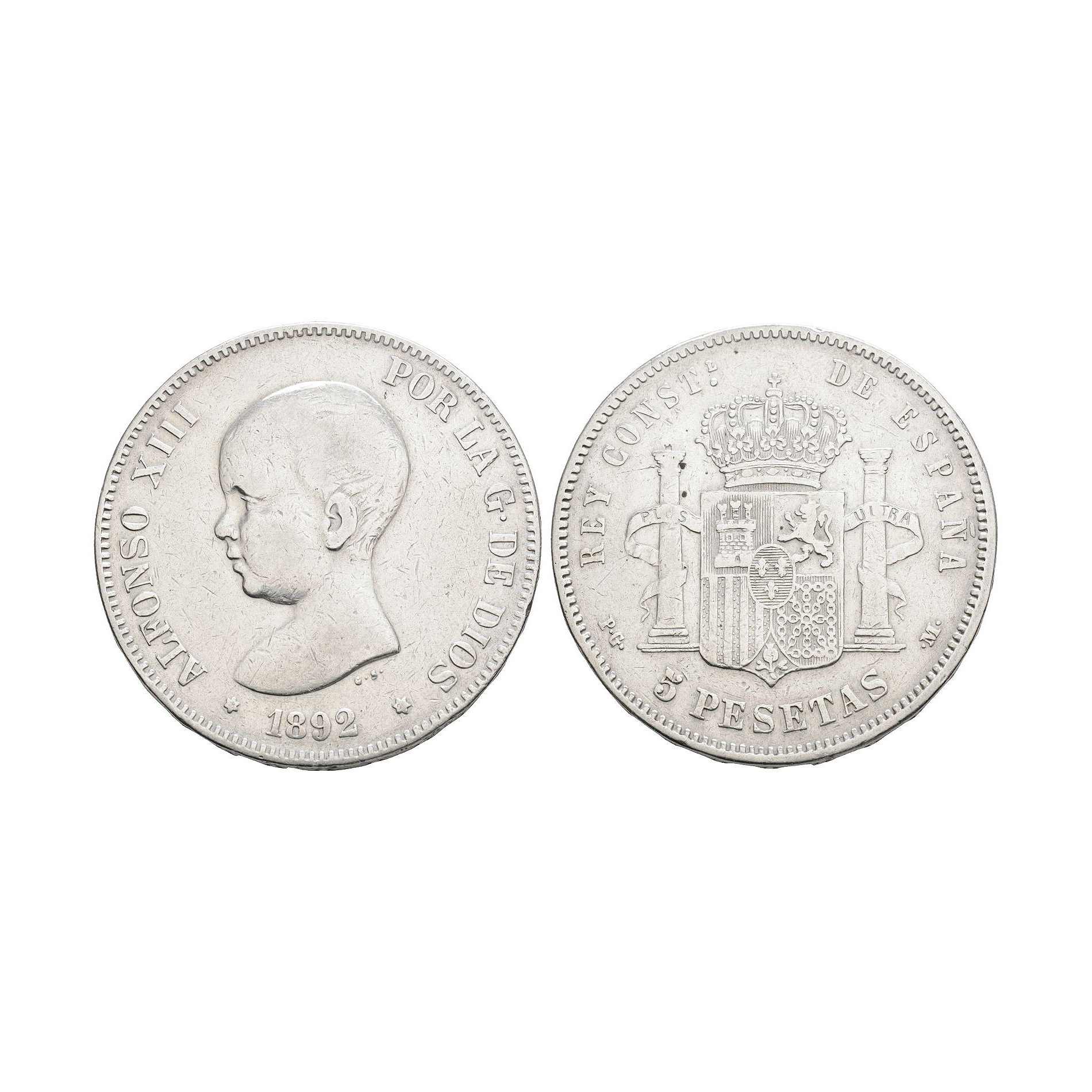 World Coins - Spain - Alfonso XIII - 1892 - 5 Pesetas Dated 1892 A.D.