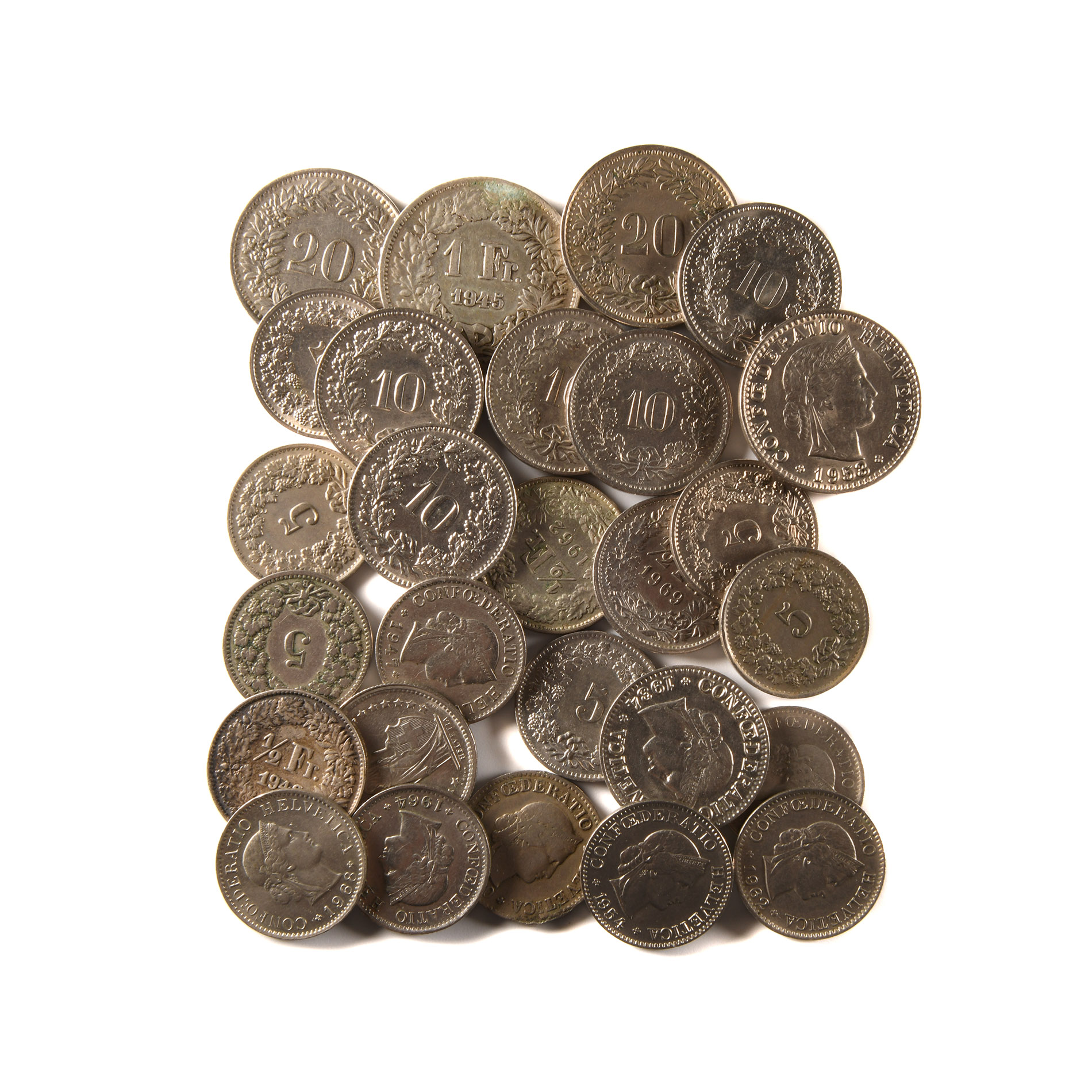 Group comprising: 5, 10 & 20 Rappen, 1/2 & 1 Franc coins of various dates and grades. 70.04 grams total.