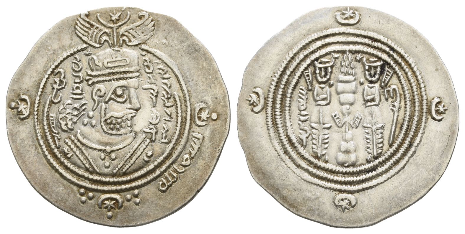 DA (Darabgird) mint. Struck by ʿAbd Allah ibn al-Zubayr, rival caliph [AH 60-73 (AD 680-692)]. Dated YE 53 (AD 684/5). Arab-Sasanian type. Draped bust to right, wearing mural crown with two wings and star-in-crescent; stars flanking, ribbon on shoulder; all within double border with pellets and star-in-crescents in margin; behind head, 'GDE ʾp̄zwt'' ('[may his] glory increase' in Pahlavi); before head, 'ʾp̄dwlʾ ʾmyl Y wlwyšnykʾn' ('ʿAbd Allah, Commander of the Believers' in Pahlavi); in the outer margin, 'bism Allāh' ('In the name of Allah' in Arabic) / Fire altar with ribbons flanked by attendants; star and crescent flanking flames; date to left, mint to right; all within triple border with star-in-crescents in margin. Album 16. 4.15gr, 30mm, 3h.