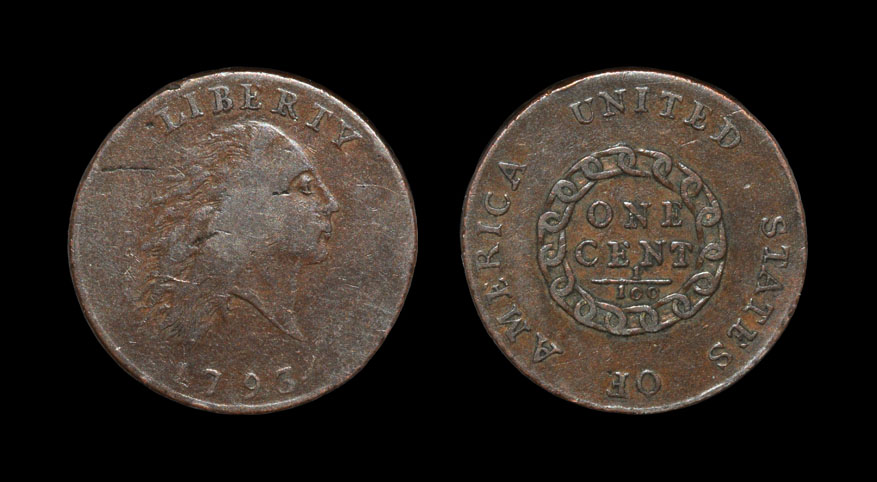 Dated 1793, first issue type, Sheldon-2, Breen 1-B (wide date obverse and AMERICA reverse). Obv: profile Liberty bust right with flowing hair, date below and LIBERTY legend. Rev: circular chain of 15 links (the link below N of UNITED slightly doubled) with ONE CENT 1/100 in three lines at centre and UNITED STATES OF AMERICA legend. Edge: vine and bars, rim plain. 13.09 grams, 26.55mm.