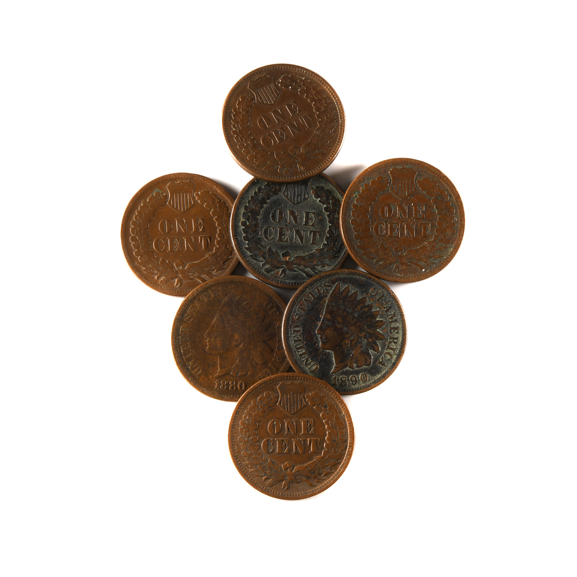Group comprising: seven Indian head cents dated 1879, 1880, 1887, 2 x 1890, 1895 & 1900. 21.05 grams total.
