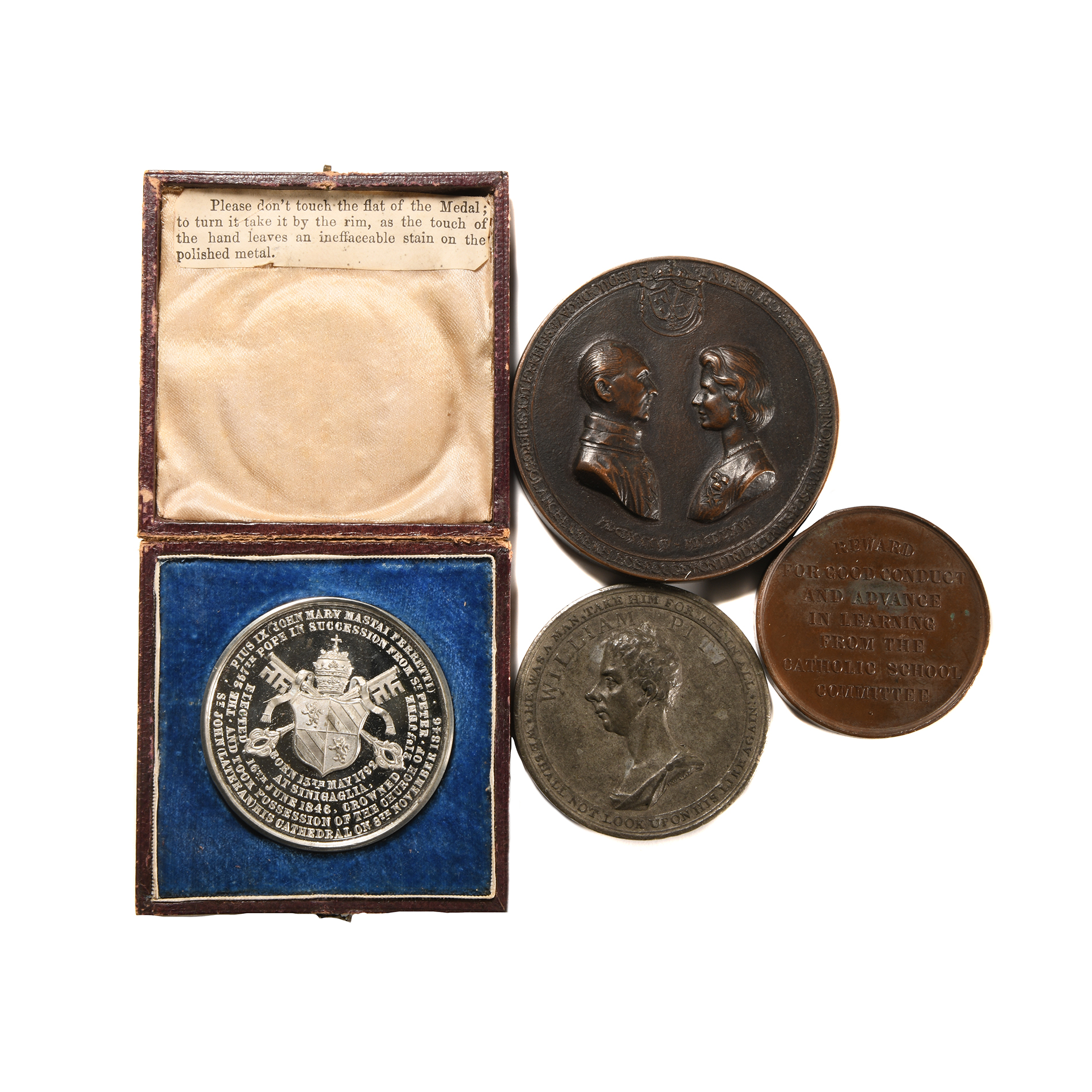 Group comprising: Pope Pius IX, inauguration (damaged case); William Pitt, white metal, 1806; Catholic School Committee school medal; with a large, uncertain medal. 375 grams total.