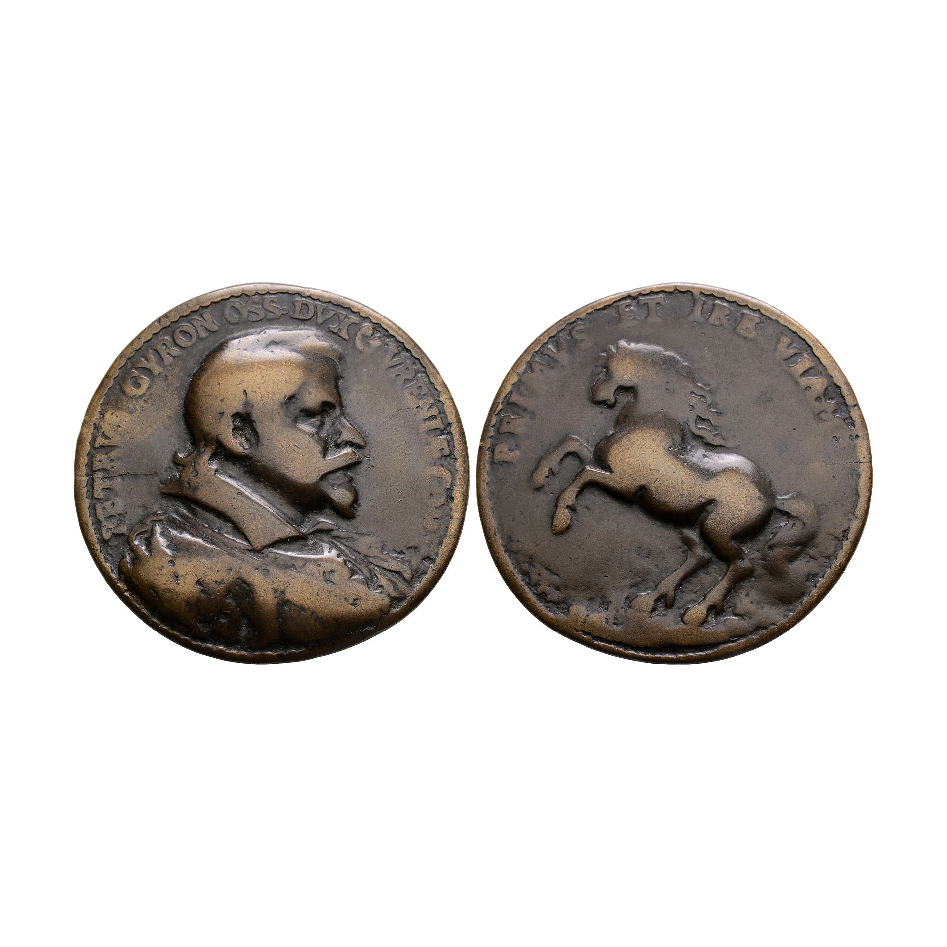 Obv: profile bust with PETRVS GYRON OSS DVX E VRENIAE COM X legend. Rev: rearing horse with PRIMVS ET IRE VIAM 1618 legend. 26.12 grams, 44 mm.
