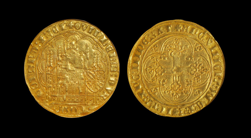 1346-1359 AD. Obv: ruler seated on throne with +GVILLELMV DVX COM HOLAND REI legend with single and double saltire stops. Rev: voided cross fleury within quatrefoil tressure with a flower symbol in each external angle and +XPC VINCIT XPC REGNAT XPC IMPERAT legend with double annulet stops. Gold, weight not recorded, 30.60 mm.