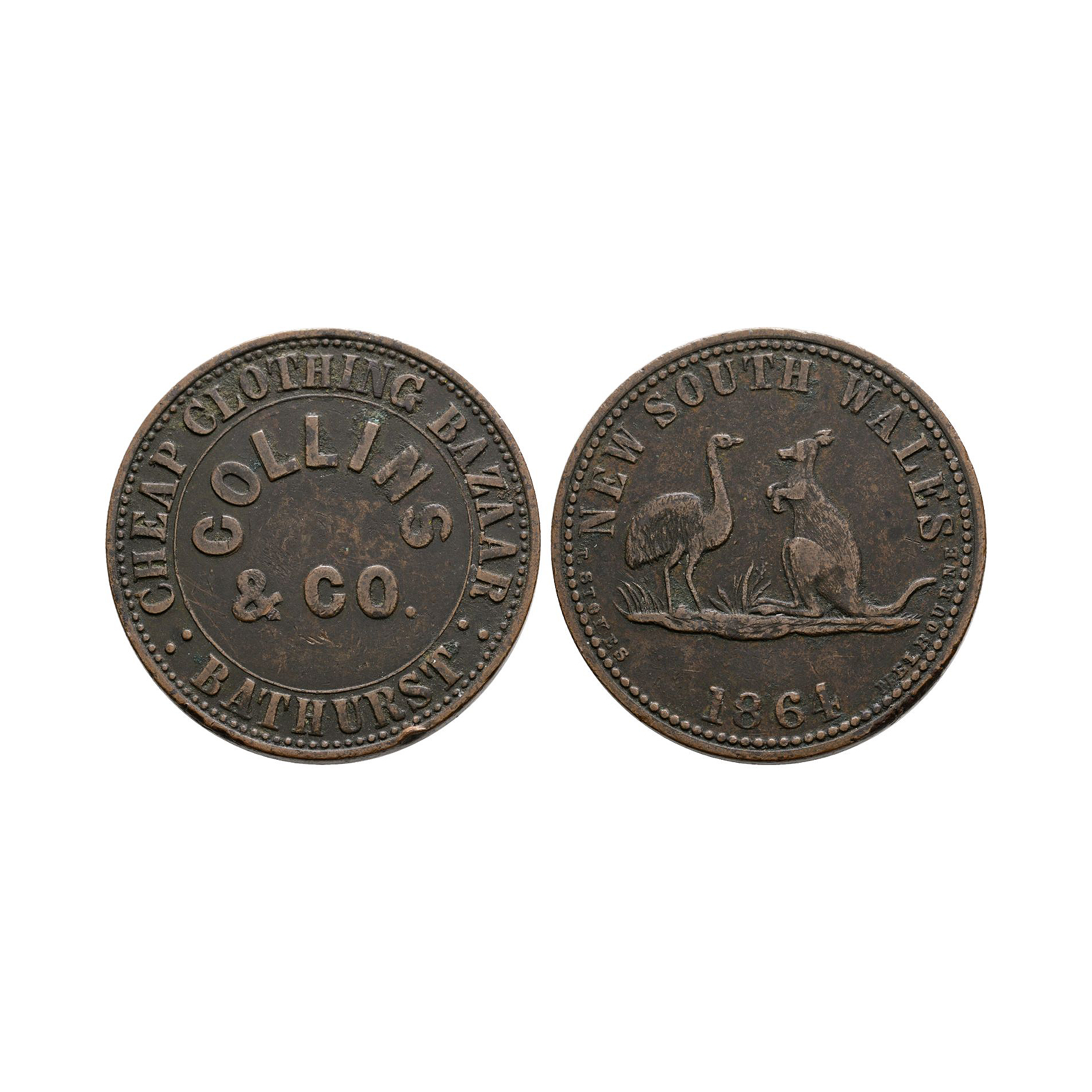 Obv: COLLINS / & CO in two lines with CHEAP CLOTHING BAZAAR BATHURST legend. Rev: emu and kangaroo with NEW SOUTH WALES legend and date below. 15.23 grams.