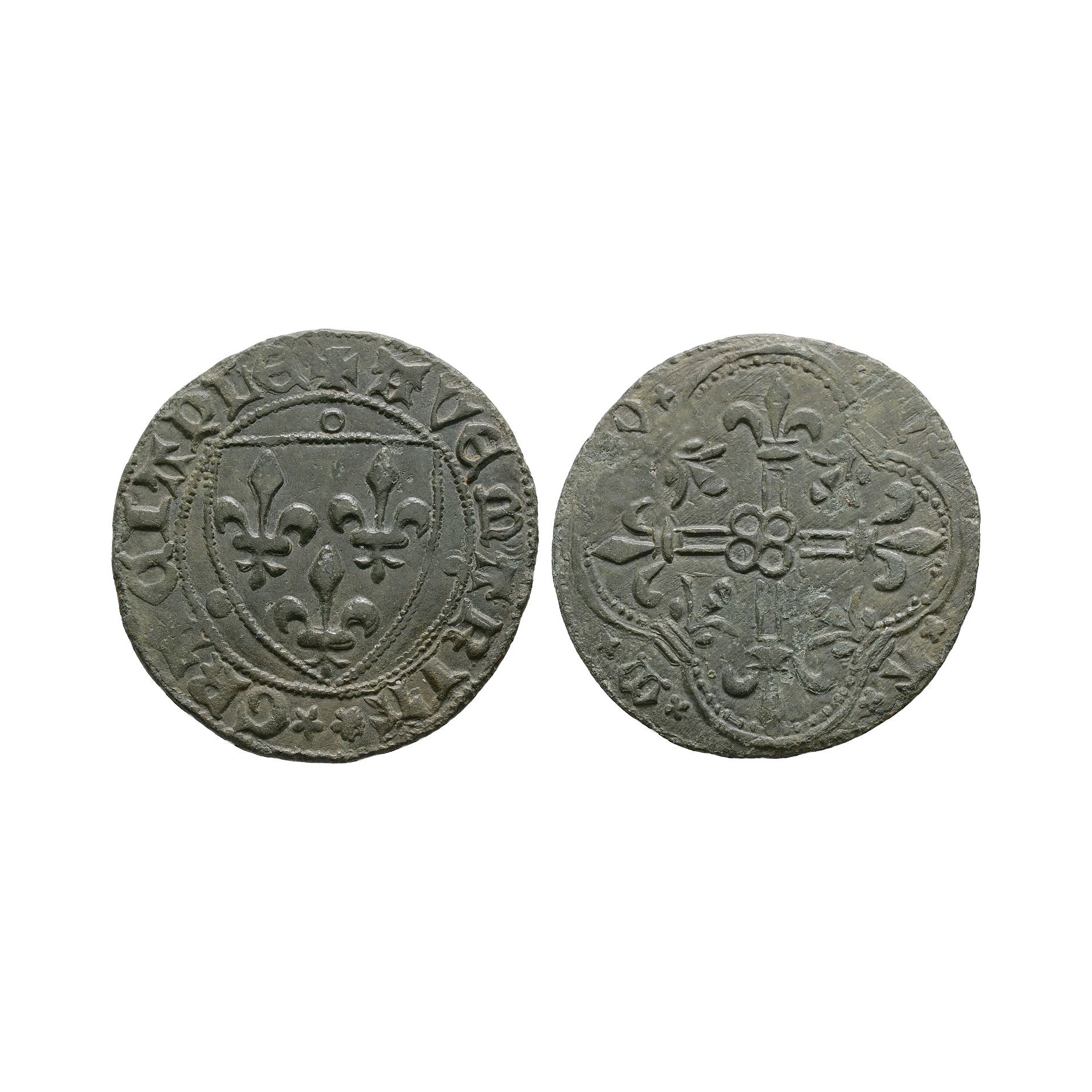 Obv: French arms with AVE MARIA GRACIA PLE legend. Rev: floriate cross within quatrefoil with fleurs on cusps and M A M O in spandrels. 3.25 grams.