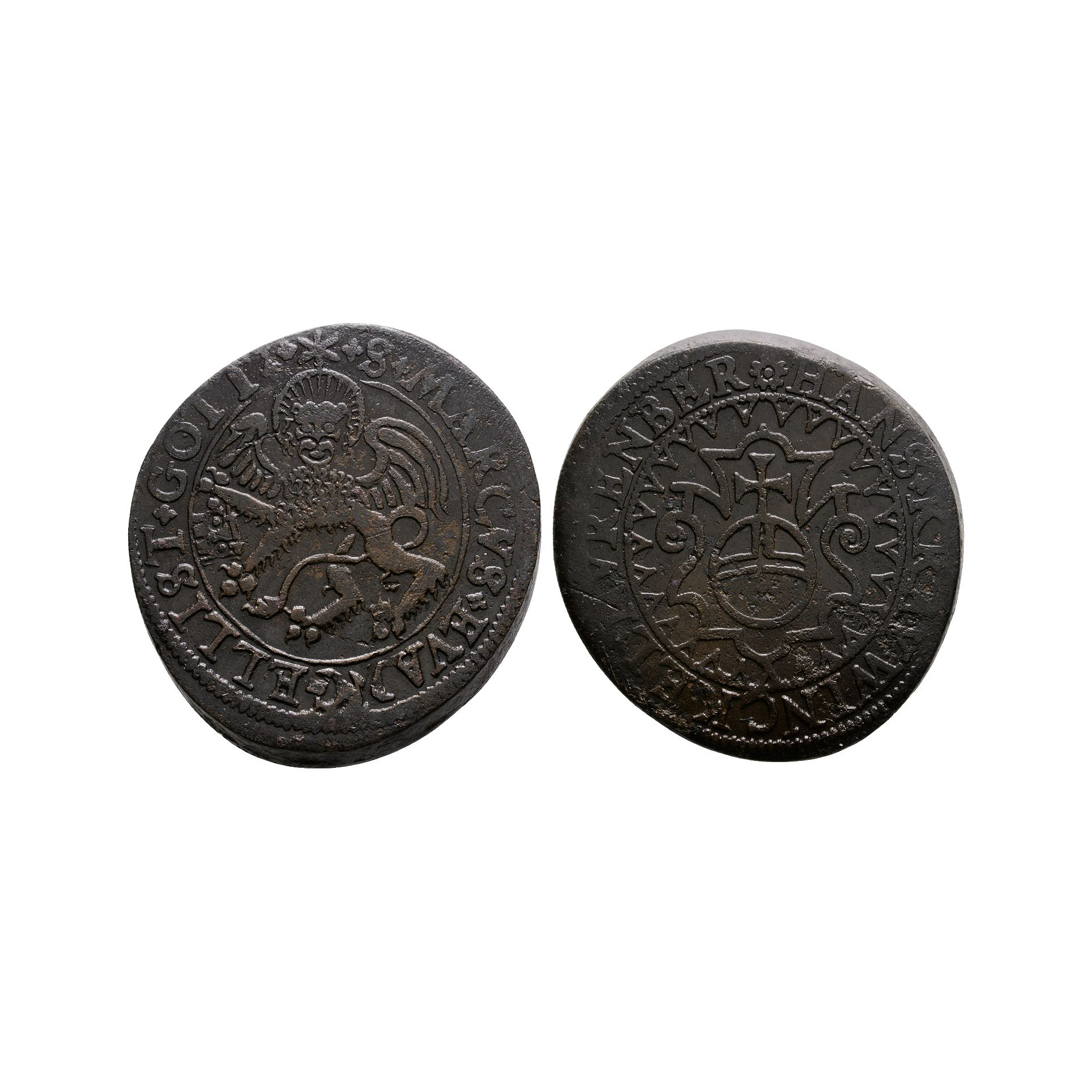Obv:nimbate lion of St Mark with S MARCVS EVANGELLIST GOTT legend. Rev: globus cruciger within ornate surround with HANS KRAVWINCKEL NVRENBER legend. 18.67 grams.