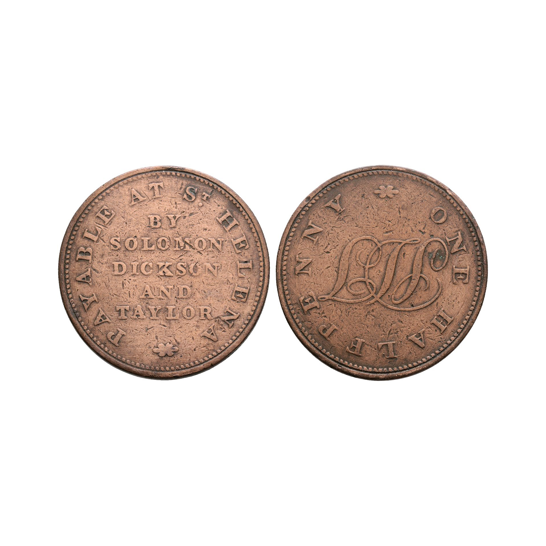 Obv: PAYABLE AT ST HELENA legend with BY / SOLOMON / DICKSON / AND / TAYLOR in five lines. Rev: SDT monogram with ONE HALFPENNY legend. 7.24 grams.