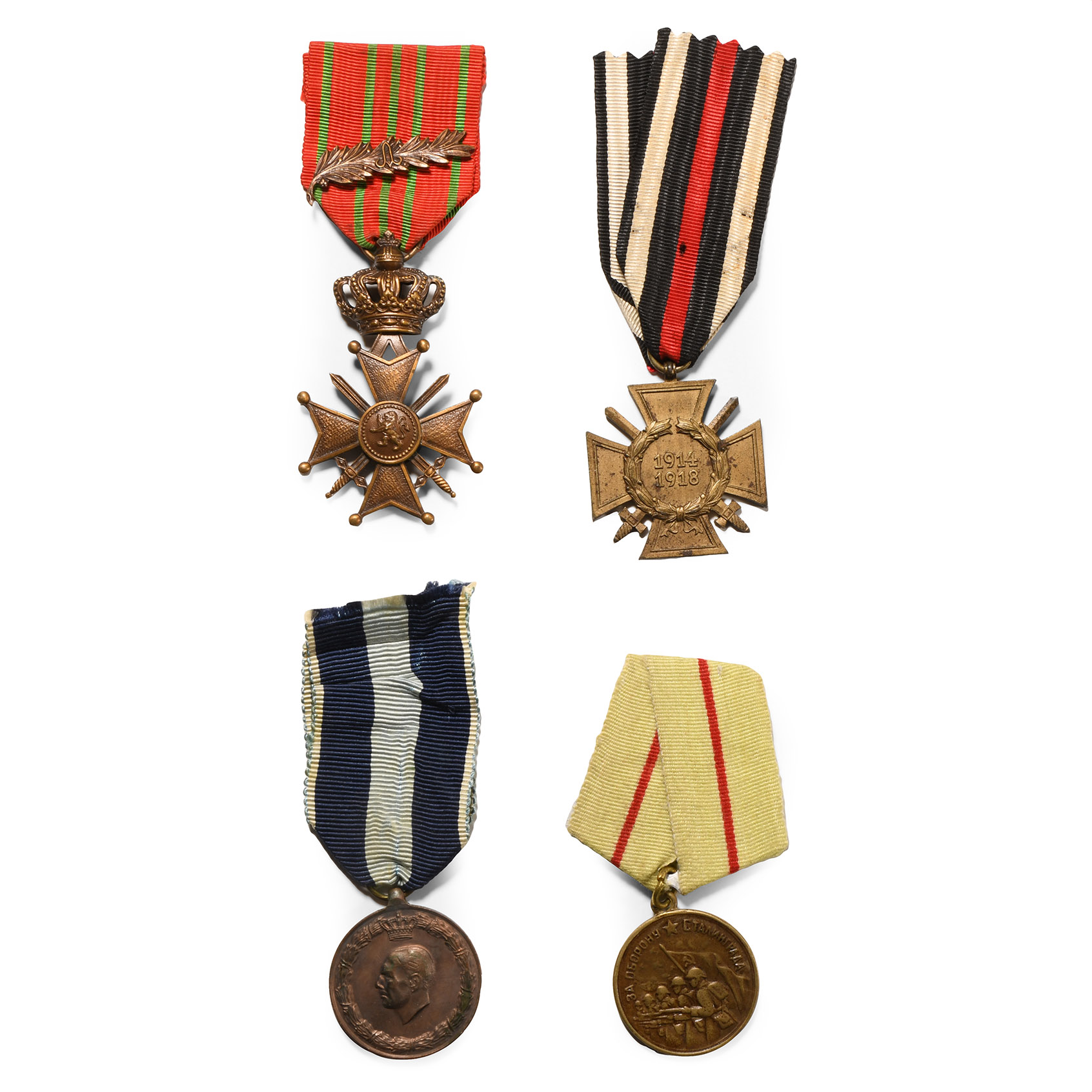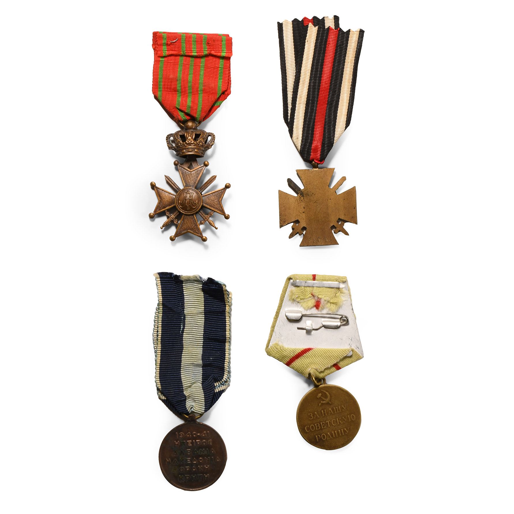 Comprising: mixed group of WWI medals including WW1 Honour Cross with Swords 1914-1918, Hindenburg Cross, Packet of issue; Hellenic Army Commemorative Medal Of The War Of 1940-1941; The Medal 'For the Defence of Stalingrad' established on December 22, 1942 by decree of the Presidium of the Supreme Soviet of the USSR; and Belgium WW1 Croix Guerre War Cross of 1914. 73.07gr total, 31-63mm excluding ribbon